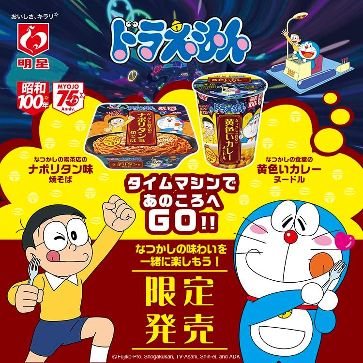 - 昭和元年から換算すると「昭和100年」を迎える2025年は、明星食品創立75周年のアニバーサリーイヤー。高い人気を誇る国民的アニメ『ドラえもん』となつかしのメニューを組み合わせたカップ焼そばを発売します。