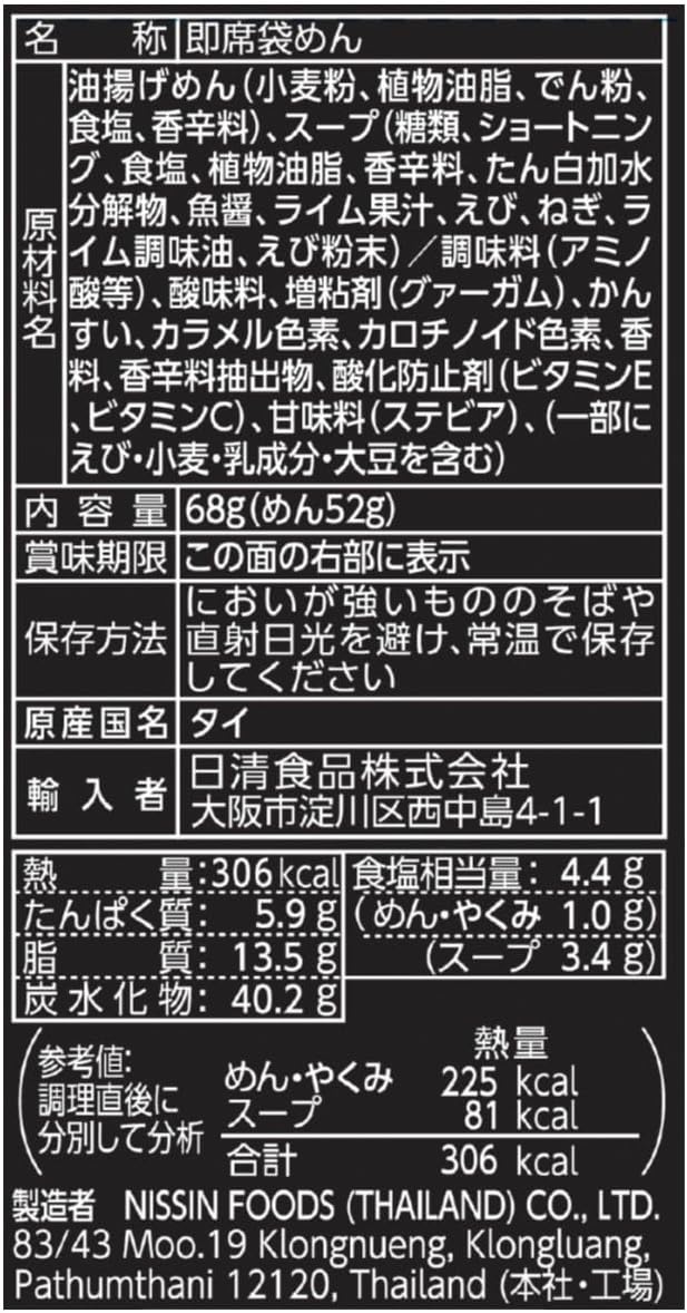 油揚げめん(小麦粉、植物油脂、でん粉、食塩、香辛料)、スープ(糖類、ショートニング、食塩、植物油脂、香辛料、たん白加水分解物、魚醤、ライム果汁、えび、ねぎ、ライム調味油、えび粉末)/調味料(アミノ酸等)、酸味料、増粘剤(グァーガム)、かんすい、カラメル色素、カロチノイド色素、香料、香辛料抽出物、酸化防止剤(ビタミンE、ビタミンC)、甘味料(ステビア)、(一部にえび・小麦・乳成分・大豆を含む)