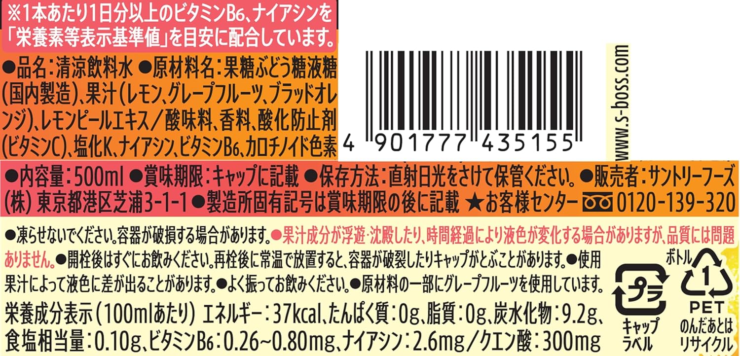 果糖ぶどう糖液糖(国内製造)、果汁(レモン、グレープフルーツ、ブラッドオレンジ)、レモンピールエキス/酸味料、香料、酸化防止剤(ビタミンC)、塩化K、ナイアシン、ビタミンB6、カロチノイド色素