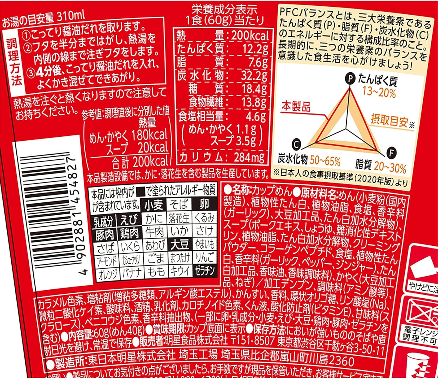 めん(小麦粉(国内製造)、植物性たん白、植物油脂、食塩、香辛料(ガーリック)、大豆加工品、たん白加水分解物)、スープ(ポークエキス、しょうゆ、難消化性デキストリン、植物油脂、たん白加水分解物、クリーミングパウダー、コラーゲンペプチド、食塩、植物性たん白、香辛料(ガーリック、ペッパー、ジンジャー)、たん白加工品、香味油、香味調味料)、かやく(大豆加工品、ねぎ)/加工デンプン、調味料(アミノ酸等)、カラメル色素、増粘剤(増粘多糖類、アルギン酸エステル)、かんすい、香料、環状オリゴ糖、リン酸塩(Na)、微粒二酸化ケイ素、酸味料、酒精、乳化剤、カロチノイド色素、くん液、酸化防止剤(ビタミンE)、甘味料(スクラロース)、ベニコウジ色素、香辛料抽出物、(一部に卵・乳成分・小麦・えび・大豆・鶏肉・豚肉・ゼラチンを含む)