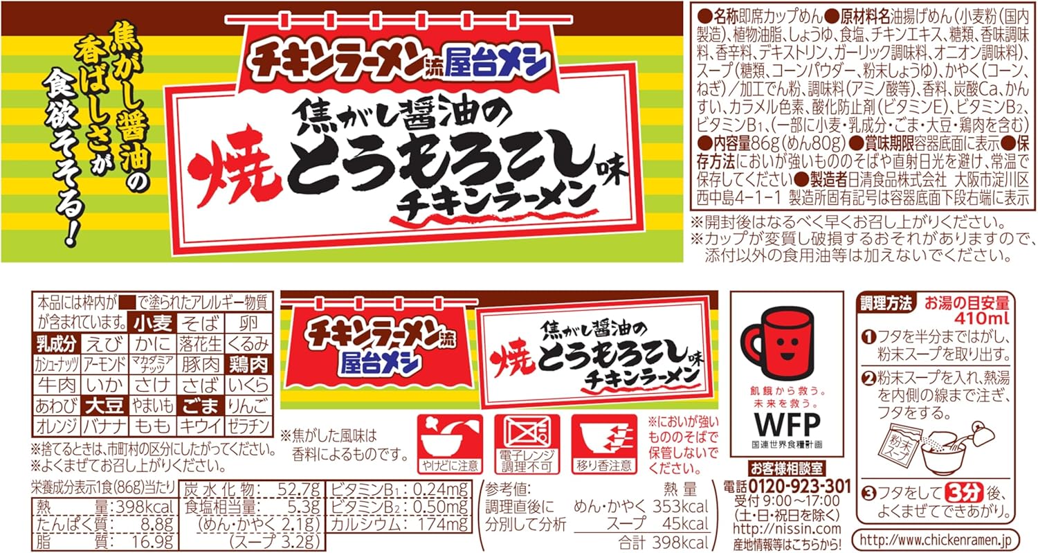 油揚げめん(小麦粉(国内製造)、植物油脂、しょうゆ、食塩、チキンエキス、糖類、香味調味料、香辛料、デキストリン、ガーリック調味料、オニオン調味料)、スープ(糖類、コーンパウダー、粉末しょうゆ)、かやく(コーン、ねぎ)/加工でん粉、調味料(アミノ酸等)、香料、炭酸Ca、かんすい、カラメル色素、酸化防止剤(ビタミンE)、ビタミンB2、ビタミンB1、(一部に小麦・乳成分・ごま・大豆・鶏肉を含む)