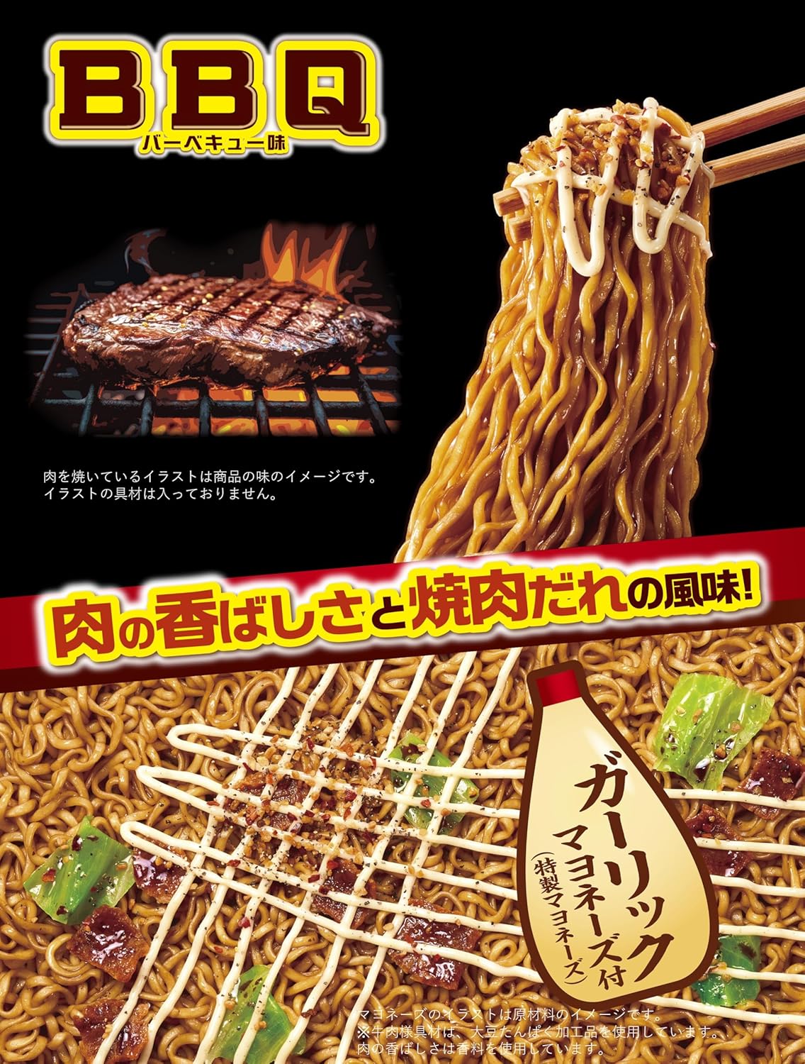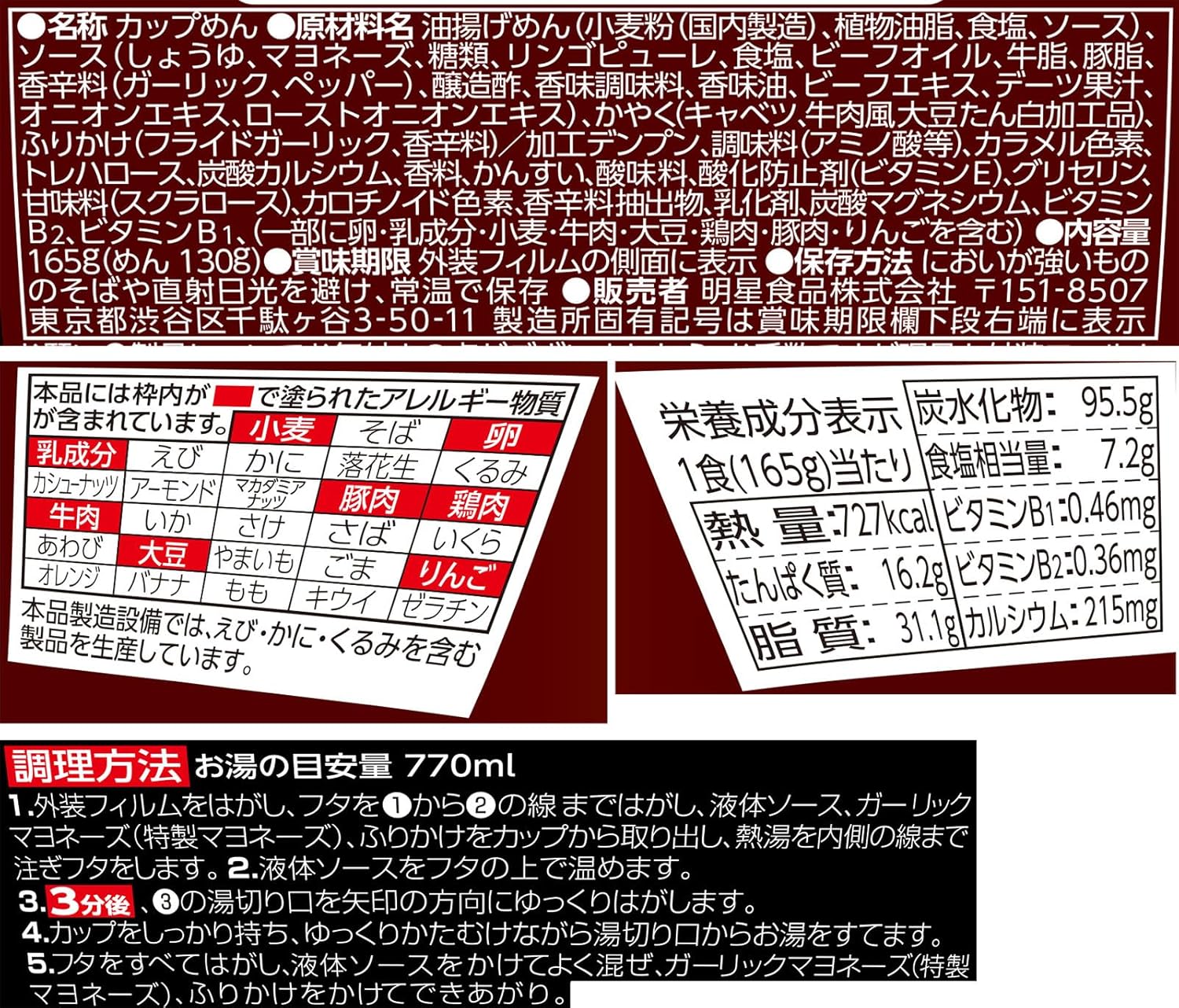 油揚げめん(小麦粉(国内製造)、植物油脂、食塩、ソース)、ソース(しょうゆ、マヨネーズ、糖類、リンゴピューレ、食塩、ビーフオイル、牛脂、豚脂、香辛料(ガーリック、ペッパー)、醸造酢、香味調味料、香味油、ビーフエキス、デーツ果汁、オニオンエキス、ローストオニオンエキス)、かやく(キャベツ、牛肉風大豆たん白加工品)、ふりかけ(フライドガーリック、香辛料)/加工デンプン、調味料(アミノ酸等)、カラメル色素、トレハロース、炭酸カルシウム、香料、かんすい、酸味料、酸化防止剤(ビタミンE)、グリセリン、甘味料(スクラロース)、カロチノイド色素、香辛料抽出物、乳化剤、炭酸マグネシウム、ビタミンB2、ビタミンB1、(一部に卵・乳成分・小麦・牛肉・大豆・鶏肉・豚肉・りんごを含む)