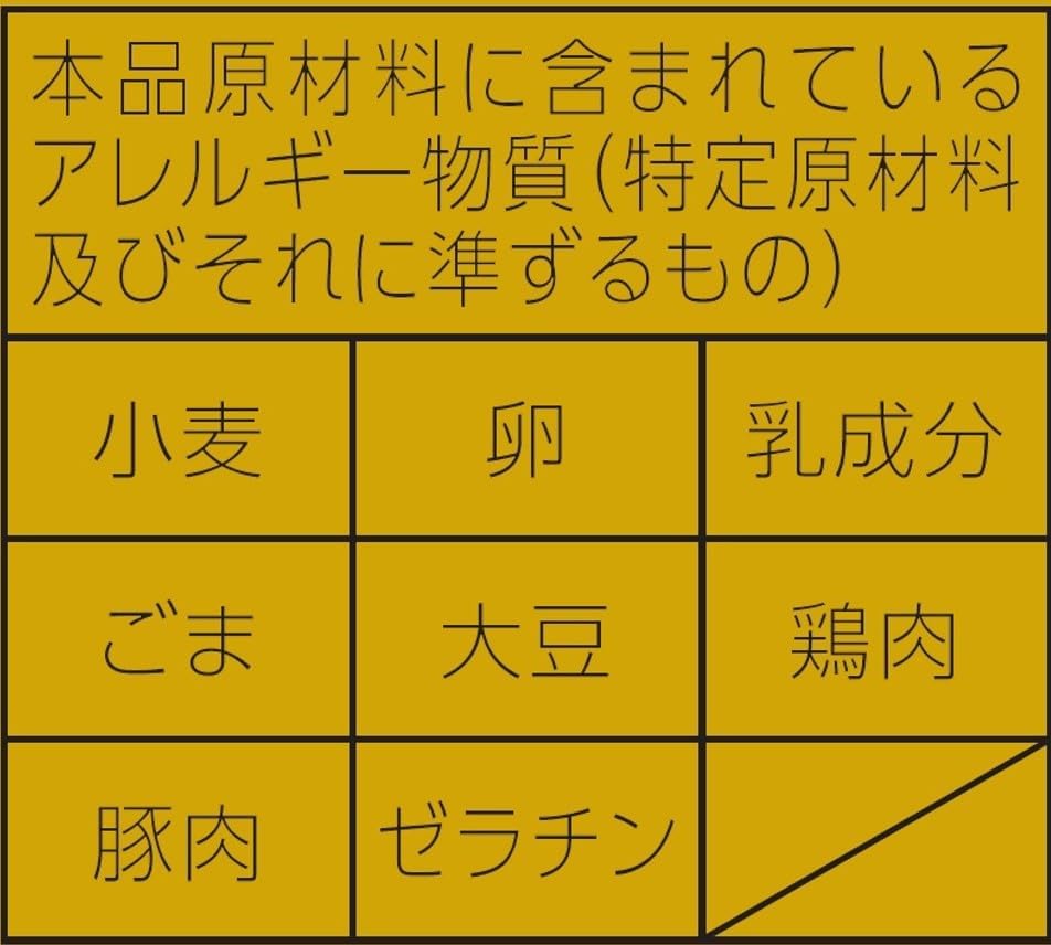 めん(小麦粉(国内製造)、でん粉、食塩、植物性たん白、こんにゃく、大豆食物繊維、植物油脂、乳糖)、添付調味料(しょうゆ、チキンエキス、植物油、豚脂、ポークエキス、発酵調味料、食塩、砂糖、香辛料、魚介エキス、たん白加水分解物、酵母エキス)、かやく(焼豚、メンマ、ねぎ、デキストリン)/加工でん粉、調味料(アミノ酸等)、酒精、かんすい、炭酸カルシウム、レシチン、酸化防止剤(ビタミンC、ビタミンE)、増粘多糖類、クチナシ色素、pH調整剤、カラメル色素、香料、ビタミンB2、ビタミンB1、(一部に小麦・卵・乳成分・ごま・大豆・鶏肉・豚肉・ゼラチンを含む)