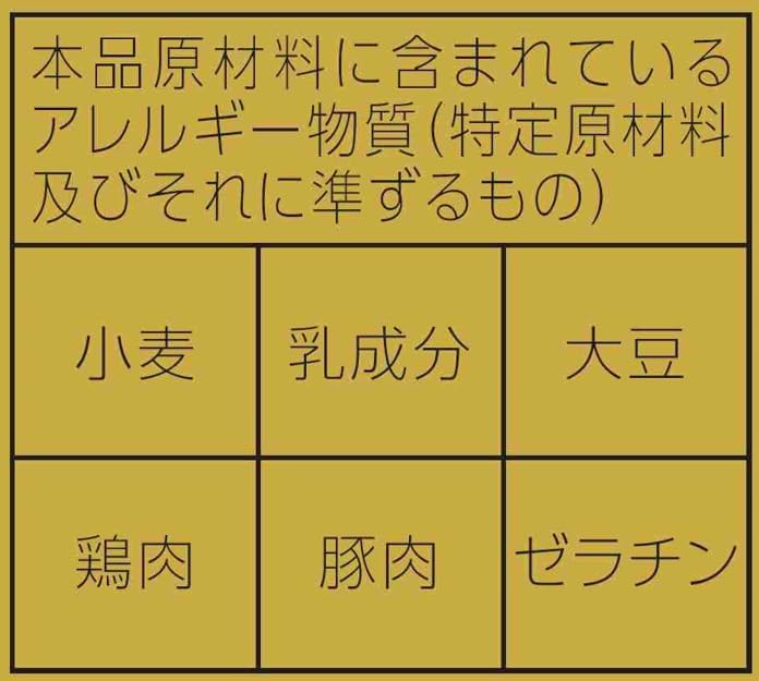 めん(小麦粉(国内製造)、でん粉、食塩、植物性たん白、こんにゃく、大豆食物繊維、植物油脂、乳糖)、添付調味料(ポークエキス、たん白加水分解物、植物油、しょうゆ、豚脂、でん粉、デキストリン、食塩、香辛料、砂糖、酵母エキス)、かやく(焼豚、メンマ、ねぎ)/加工でん粉、調味料(アミノ酸等)、酒精、かんすい、増粘多糖類、炭酸カルシウム、レシチン、カラメル色素、香料、pH調整剤、酸化防止剤(ビタミンE、ビタミンC)、香辛料抽出物、ビタミンB2、ベニコウジ色素、ビタミンB1、(一部に小麦・乳成分・大豆・鶏肉・豚肉・ゼラチンを含む)